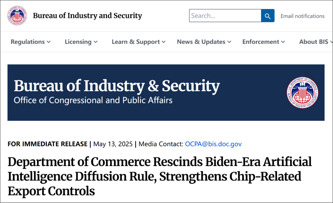 1. 美国商务部撤销人工智能扩散规则,但仍强化对华芯片出口管制